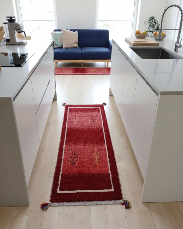 深めの赤と明るい赤のツートーンの地に、ギャッベらしい生命の樹や羊のモチーフが、シンプルに並ぶお洒落な一枚です。シンプルなので、どこにでも合わせやすく、ほどより可愛さ魅力的です。 細長いランナーと呼ばれるサイズで、キッチンマットやベッドサイドなど、ちょっとしたスペースに敷いていただけます。程よい厚みがあり、クッション性にも優れ、足元の冷え対策にも一役かいます。 ペルシャ手織絨毯(ギャッベ) 【寸法】約54×152cm ※フリンジのサイズは含みません。 【産地】イラン製 【素材】ウール100% ※こちらの商品は一点ものにつき、売り違いの際はご容赦くださいませ。