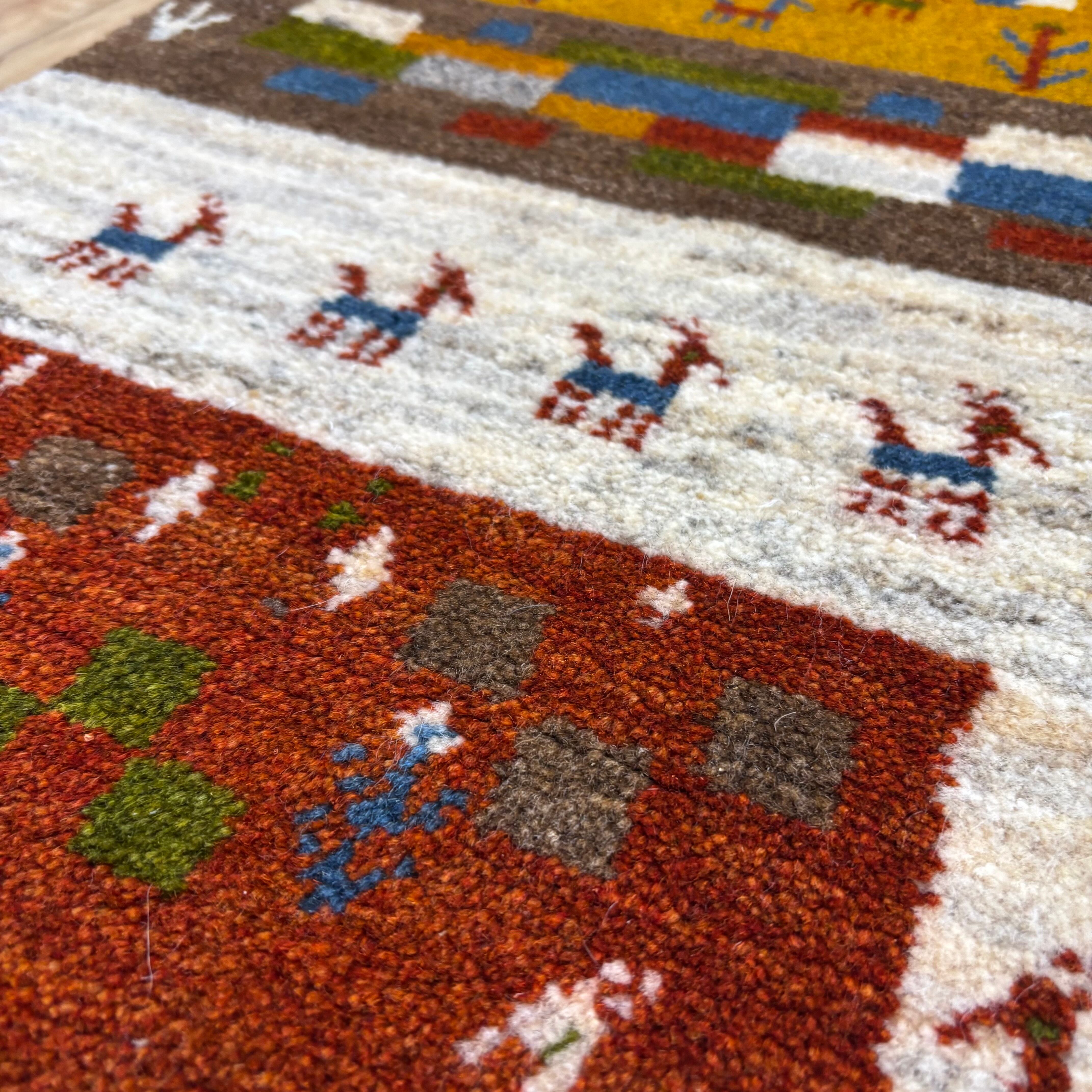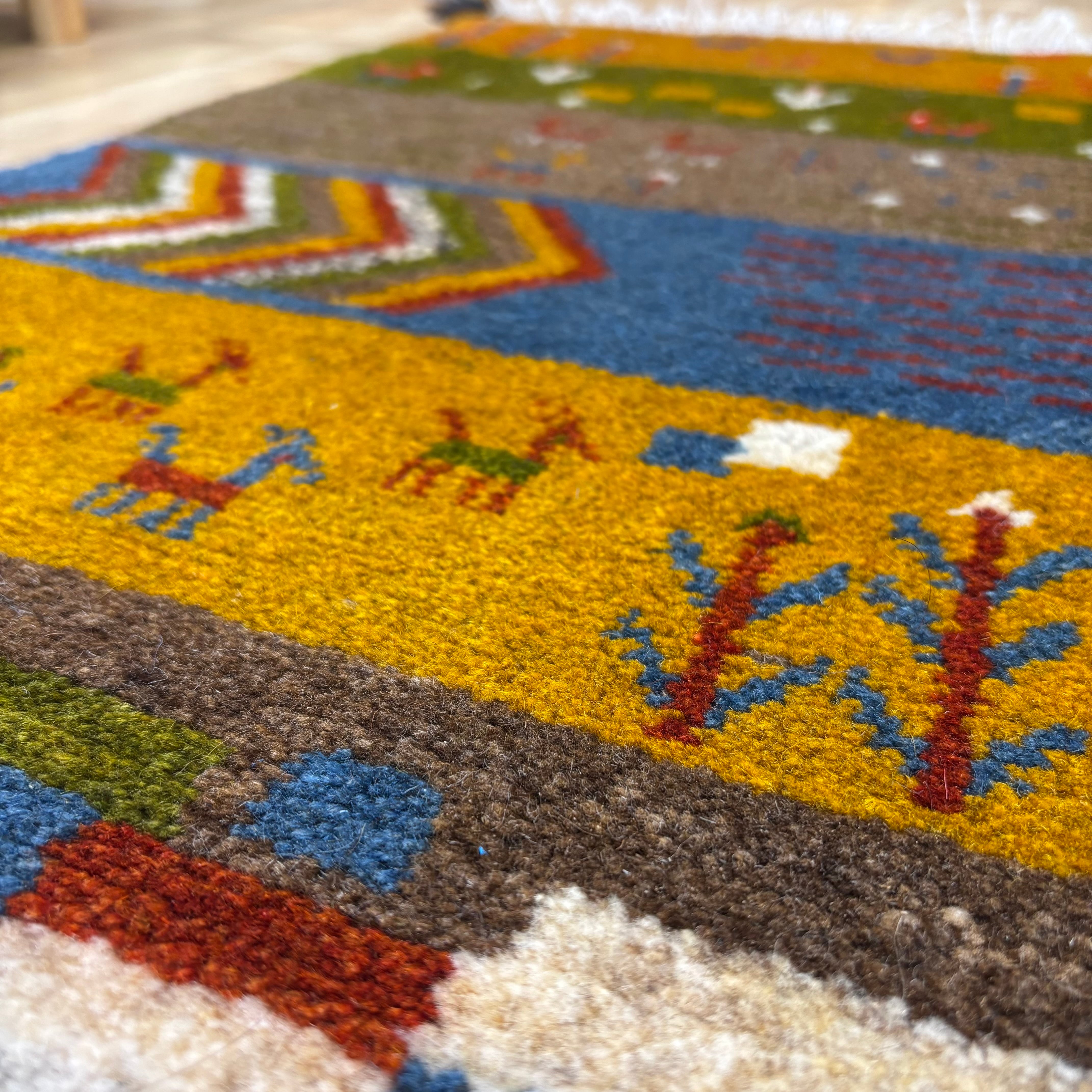 ギャッベらしい生命の樹や羊(山羊)などが散りばめられた楽しくカワイイ一枚です。