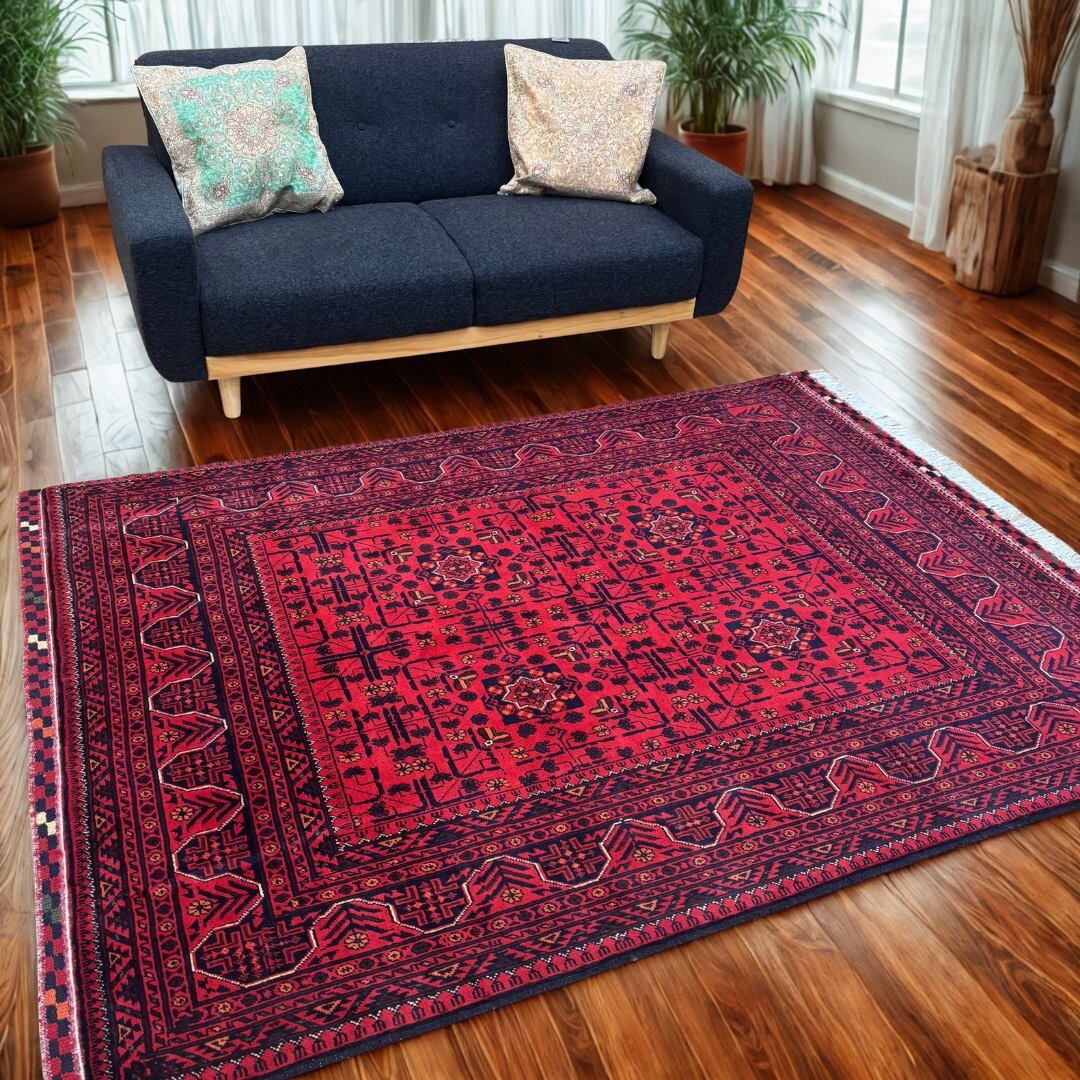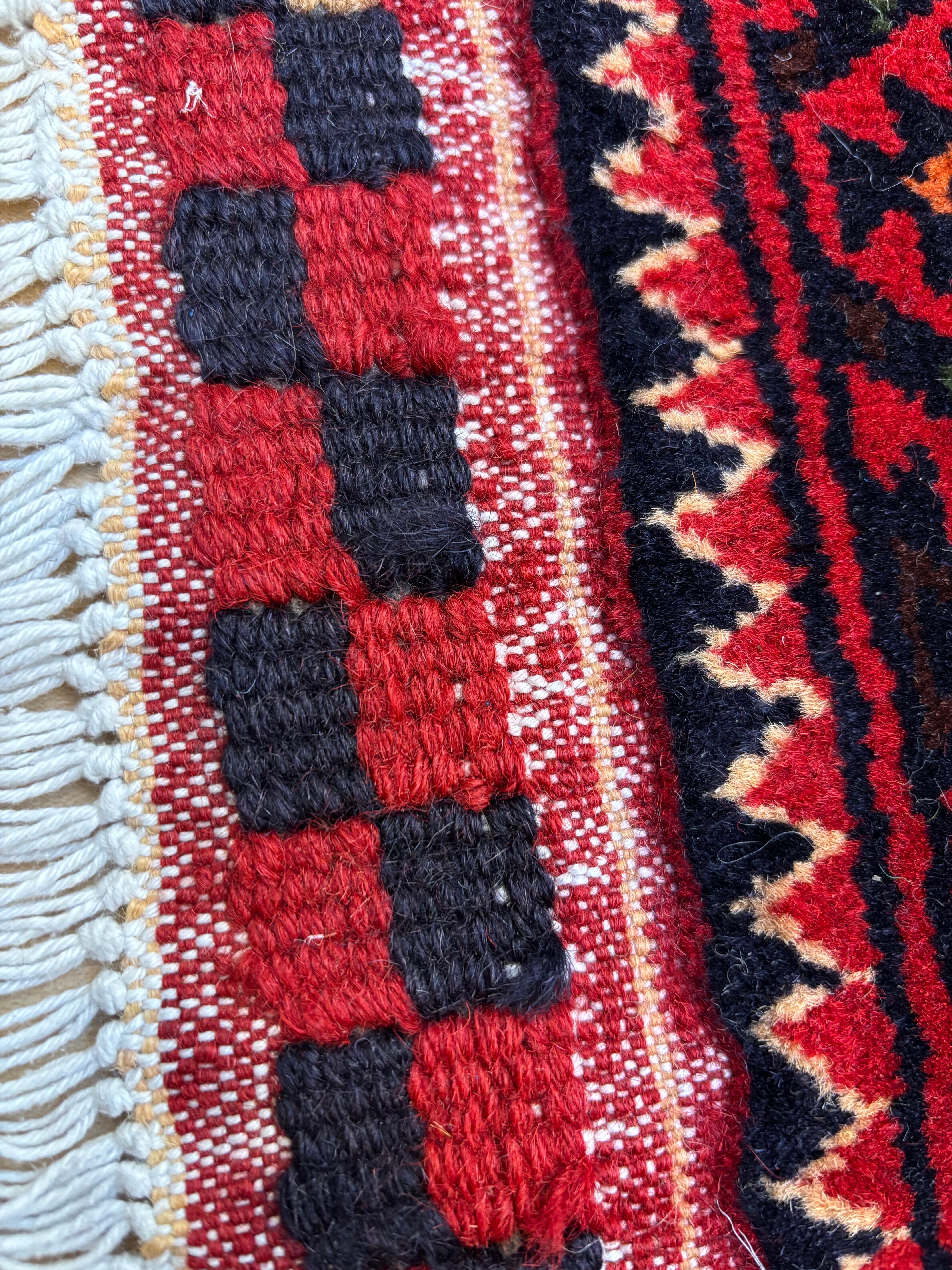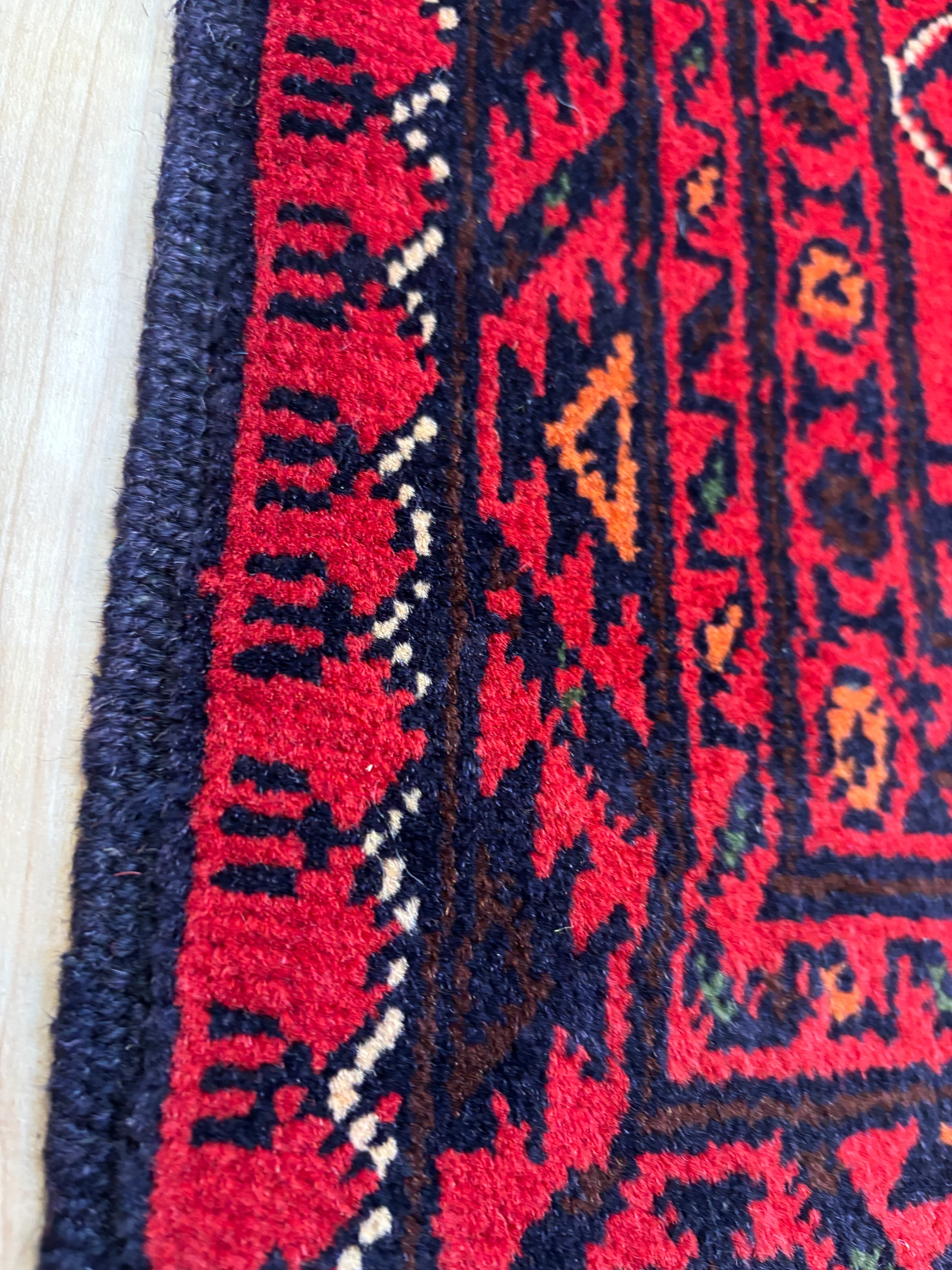 砂漠に沈む真っ赤な夕陽を思わせる深紅が、とても美しく、濃紺で織り込まれた幾何学模様と相まって、力強さや静かなエネルギーを感じる一枚です。
