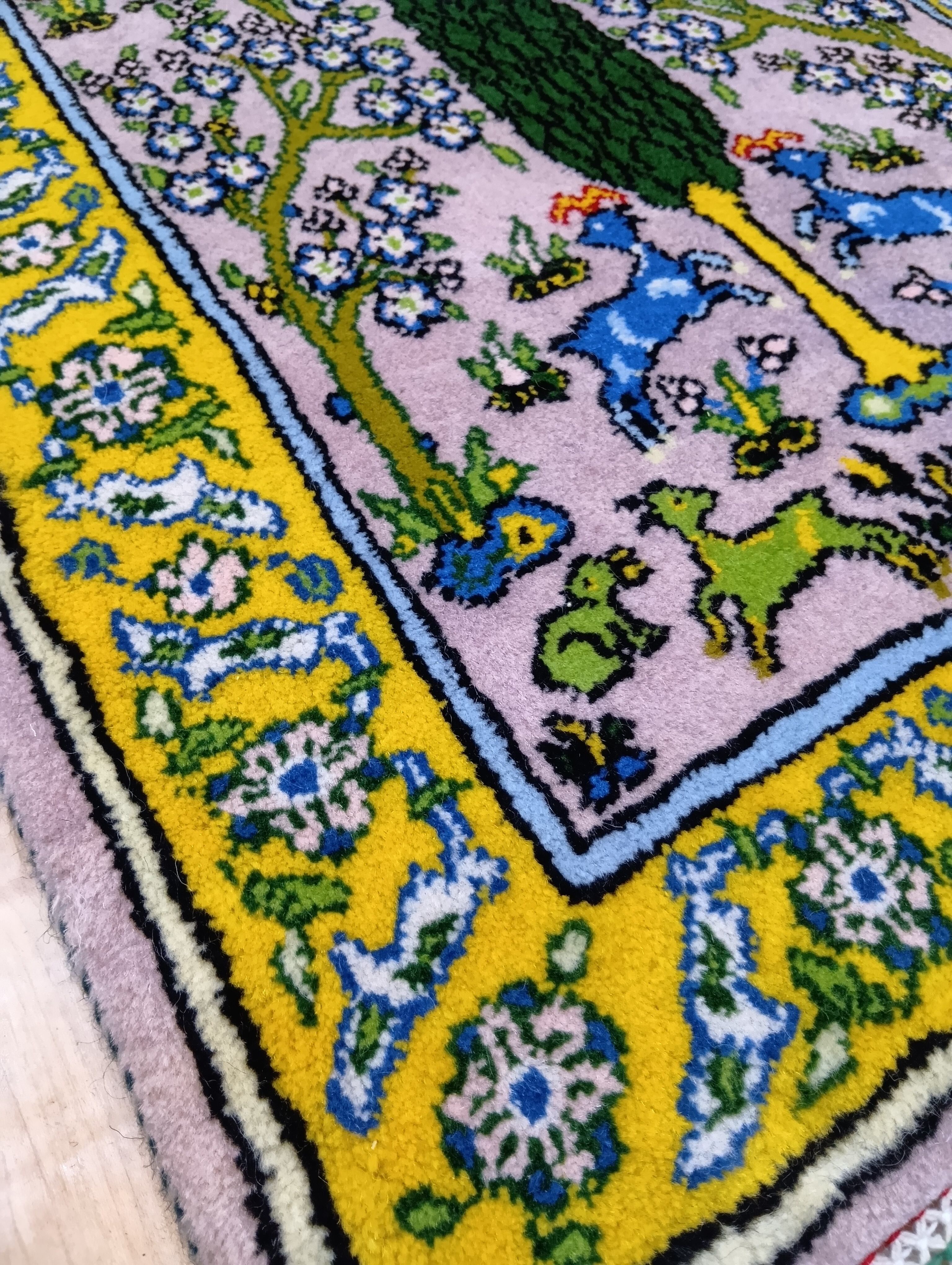 春の息吹と自然の美しさを感じさせる、「生命の木と愛らしい鹿のモチーフ」ペルシャ絨毯です。繊細な生命の木が描かれ、その周囲には愛らしい鹿が遊ぶ姿が、まるで自然の中にいるような心地よさ。この絨毯は、ラベンダーピンクとイエローのボーダーを基調としております。