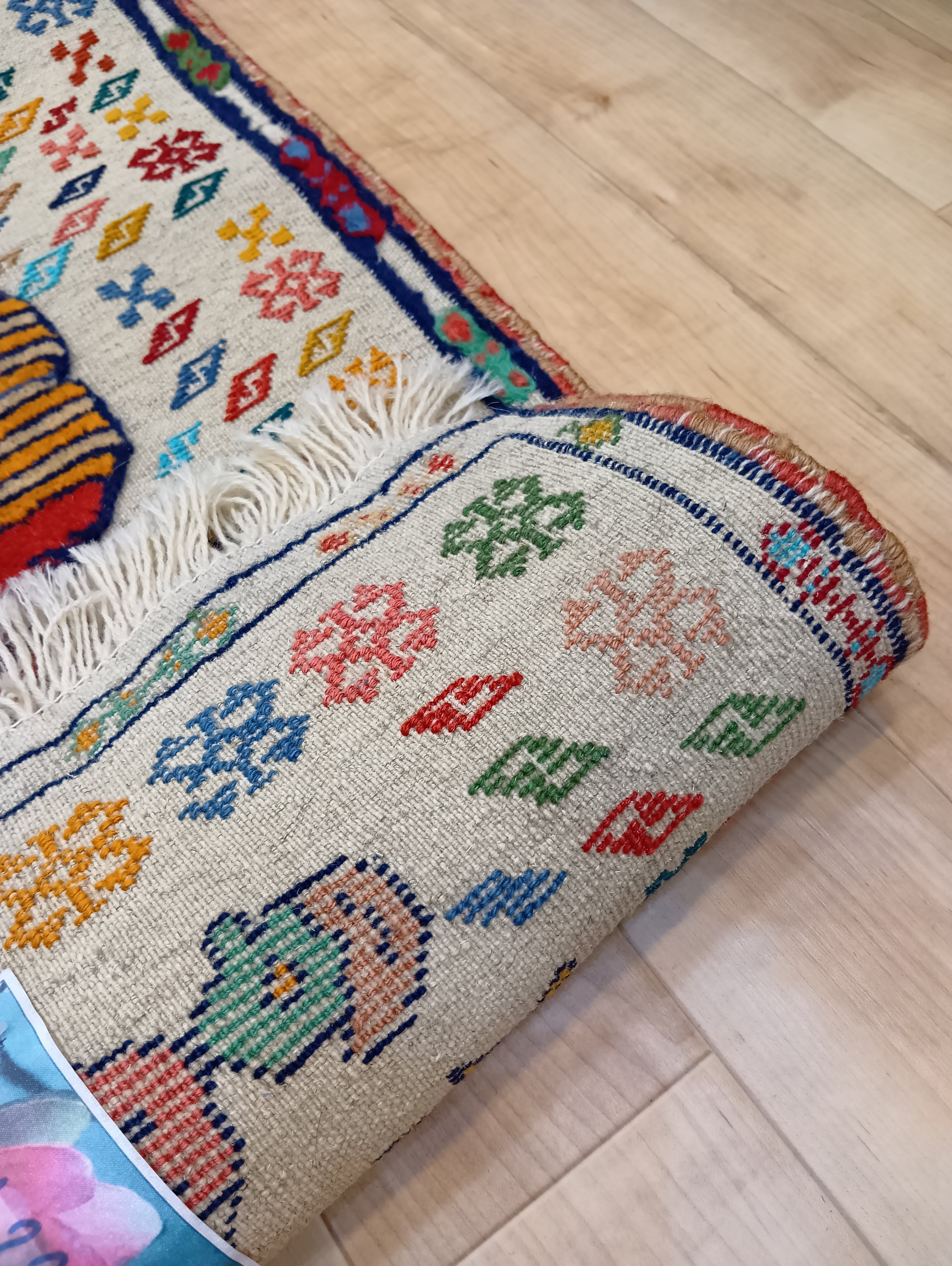 カラフルなラクダのキャラバン隊が歩く、エキゾチックで愛らしいデザインのペルシャ手織キリムです。毛足のある部分と平織りのキリムデザインが一体となったユニークな仕上がりとなっています。キリムの中から飛び出してきそうな、見る人を楽しませるアイテムです。