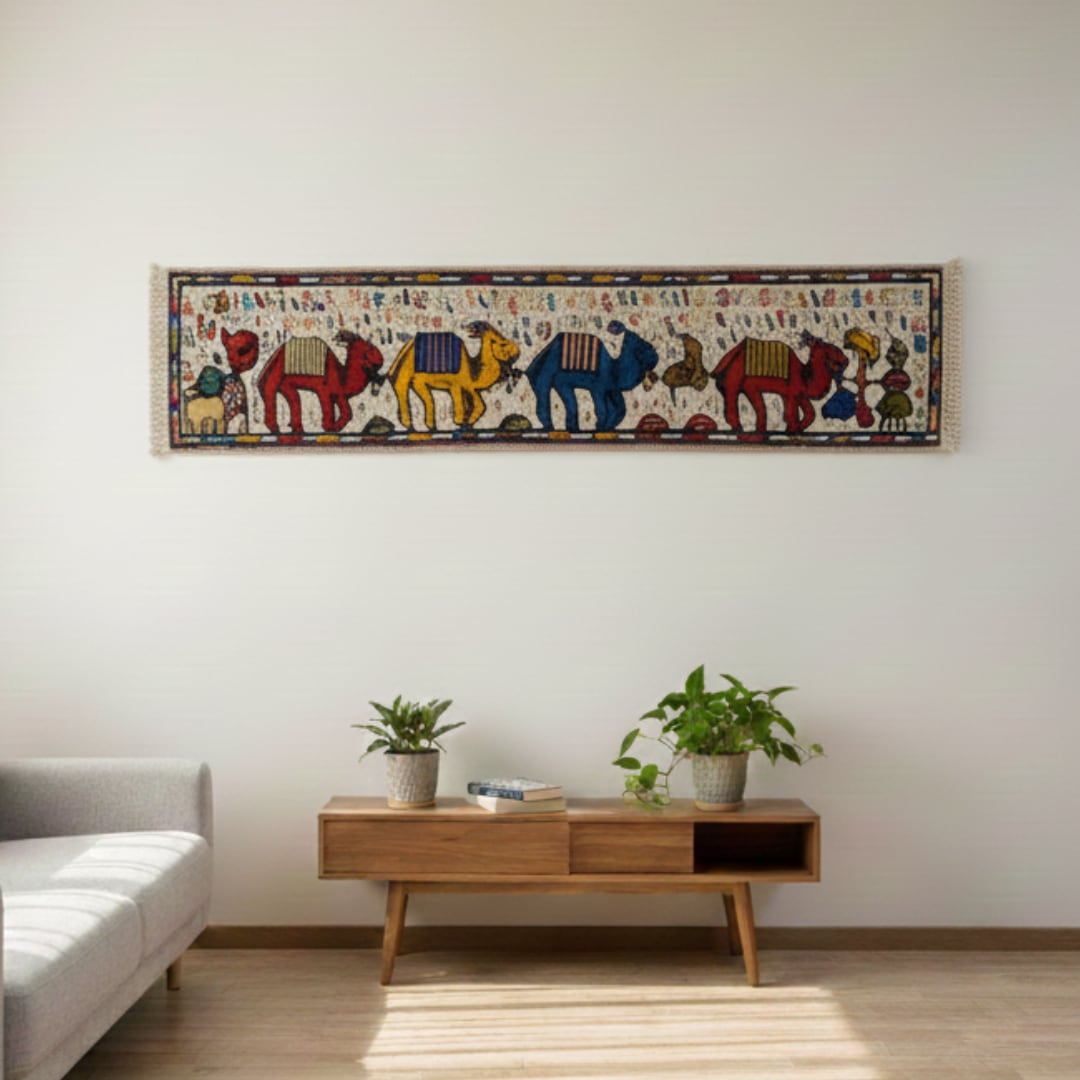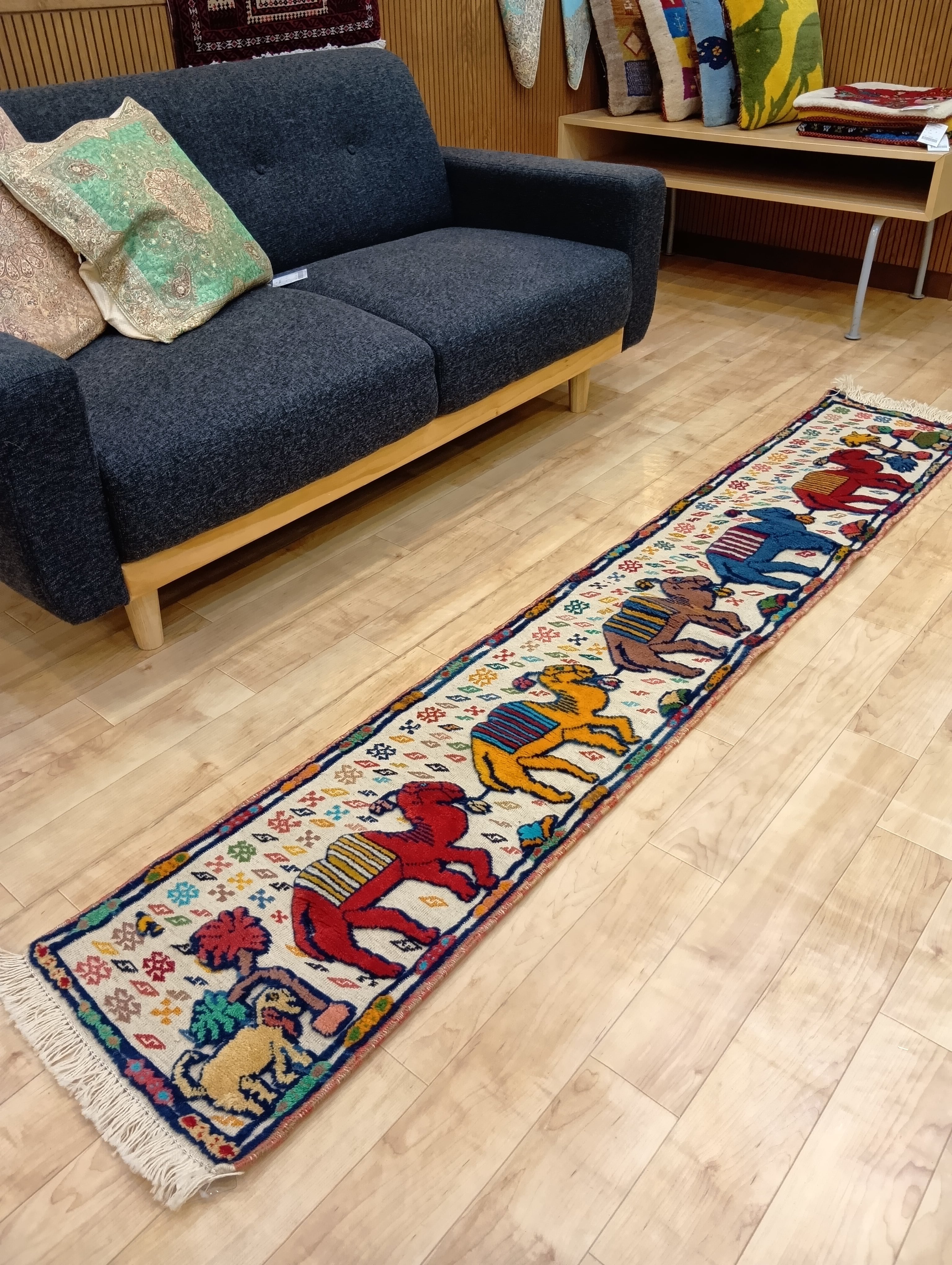 「カラフルラクダのキャラバン隊」(オフホワイト)ペルシャ手織キリム 【約36×205cm】(送料無料)