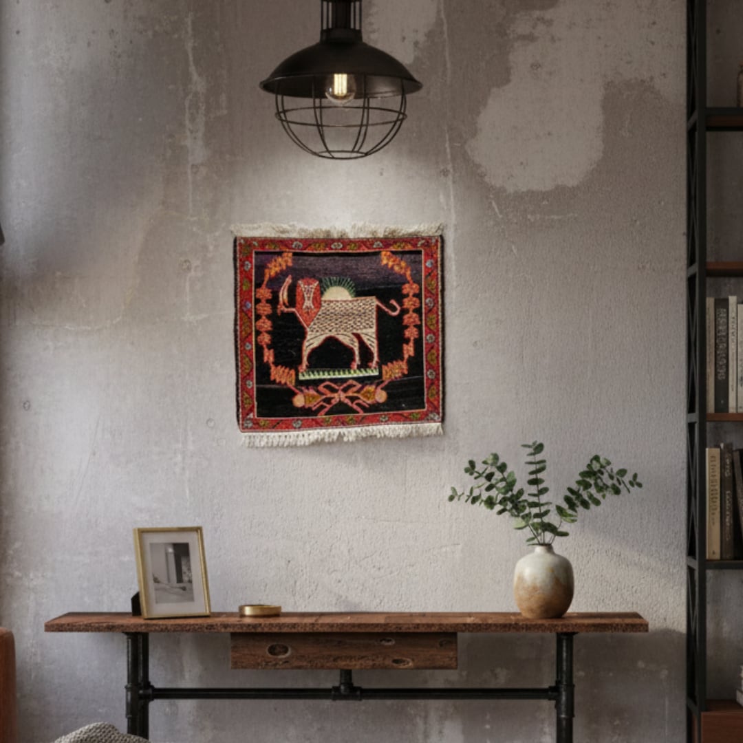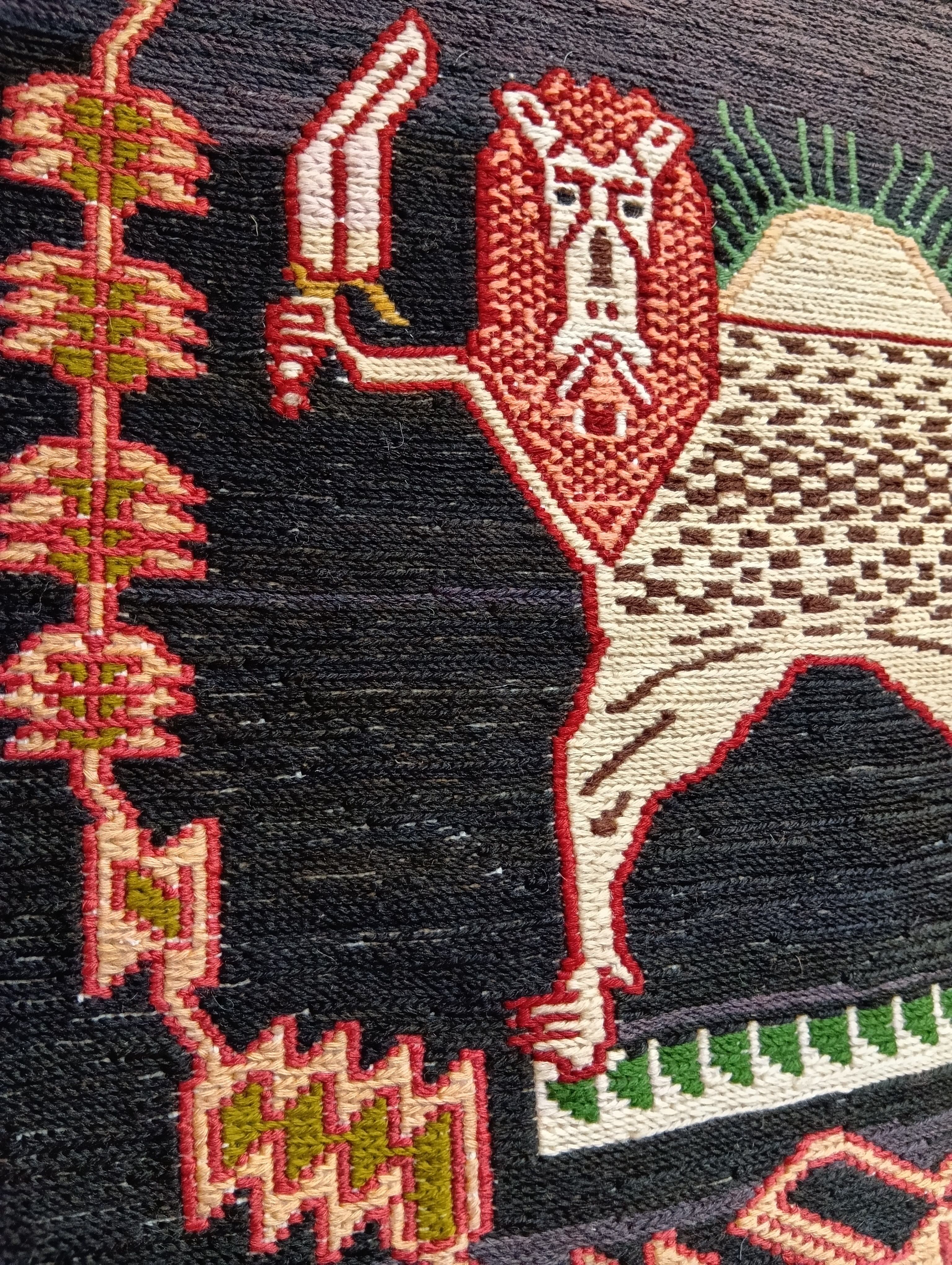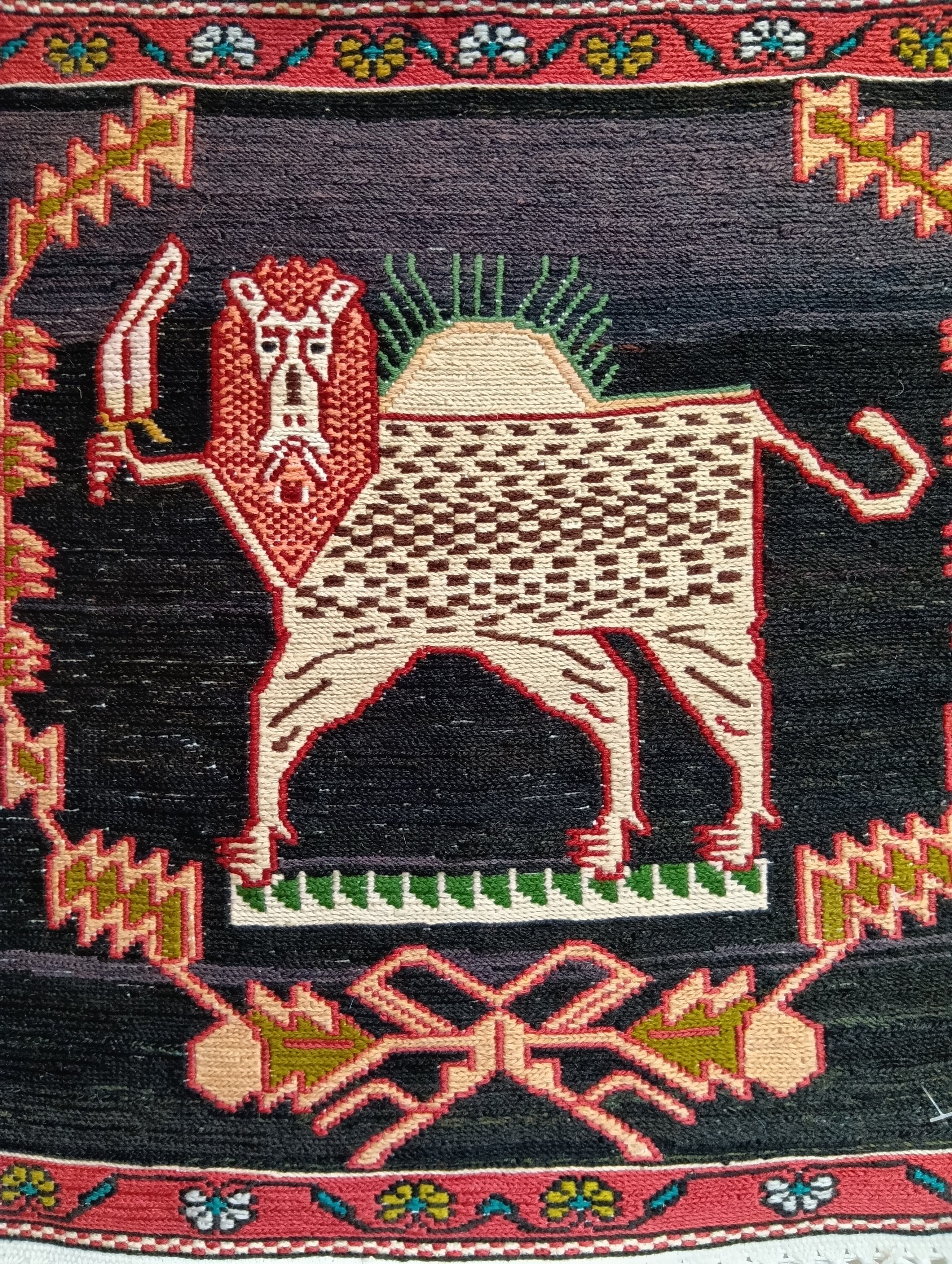 歴代のイランの国旗にも配されていた「サーベルライオン」を織り上げたキリム(平織り)です。サーベル(刀)を持ち、背後から太陽が神々しく照らし、悠々と立つライオンは、リーダーシップや権力、統率力、愛と勇気の象徴です。