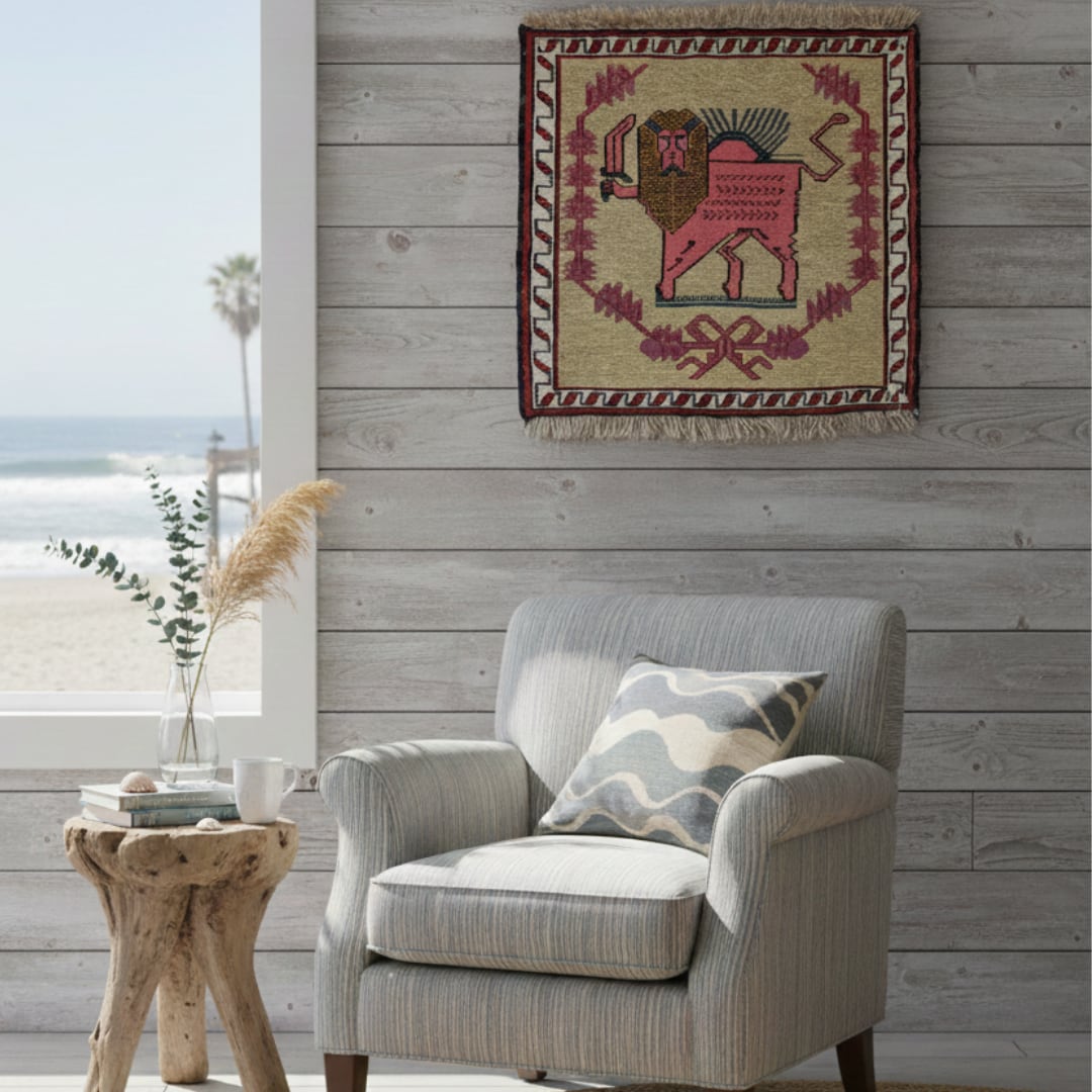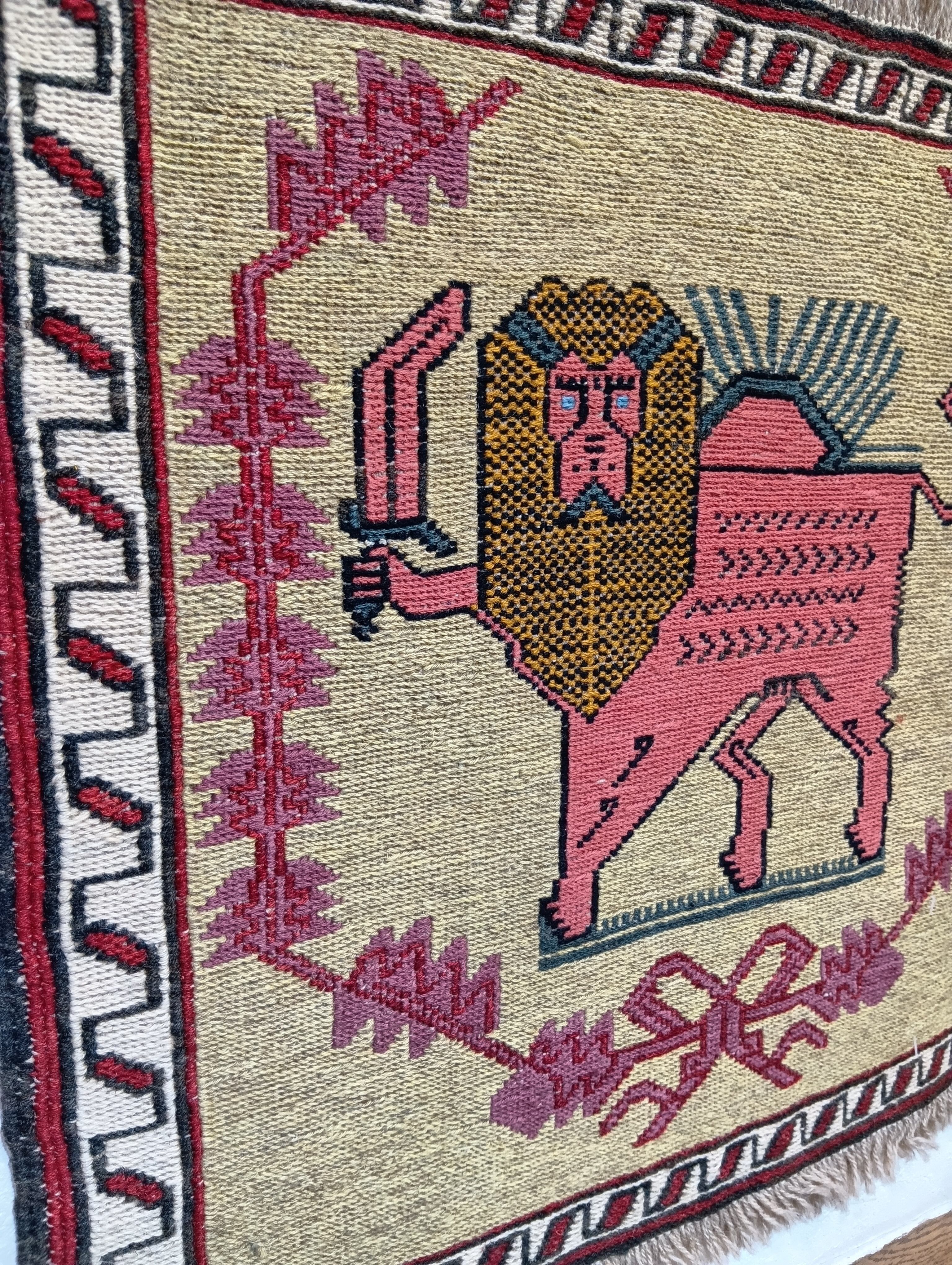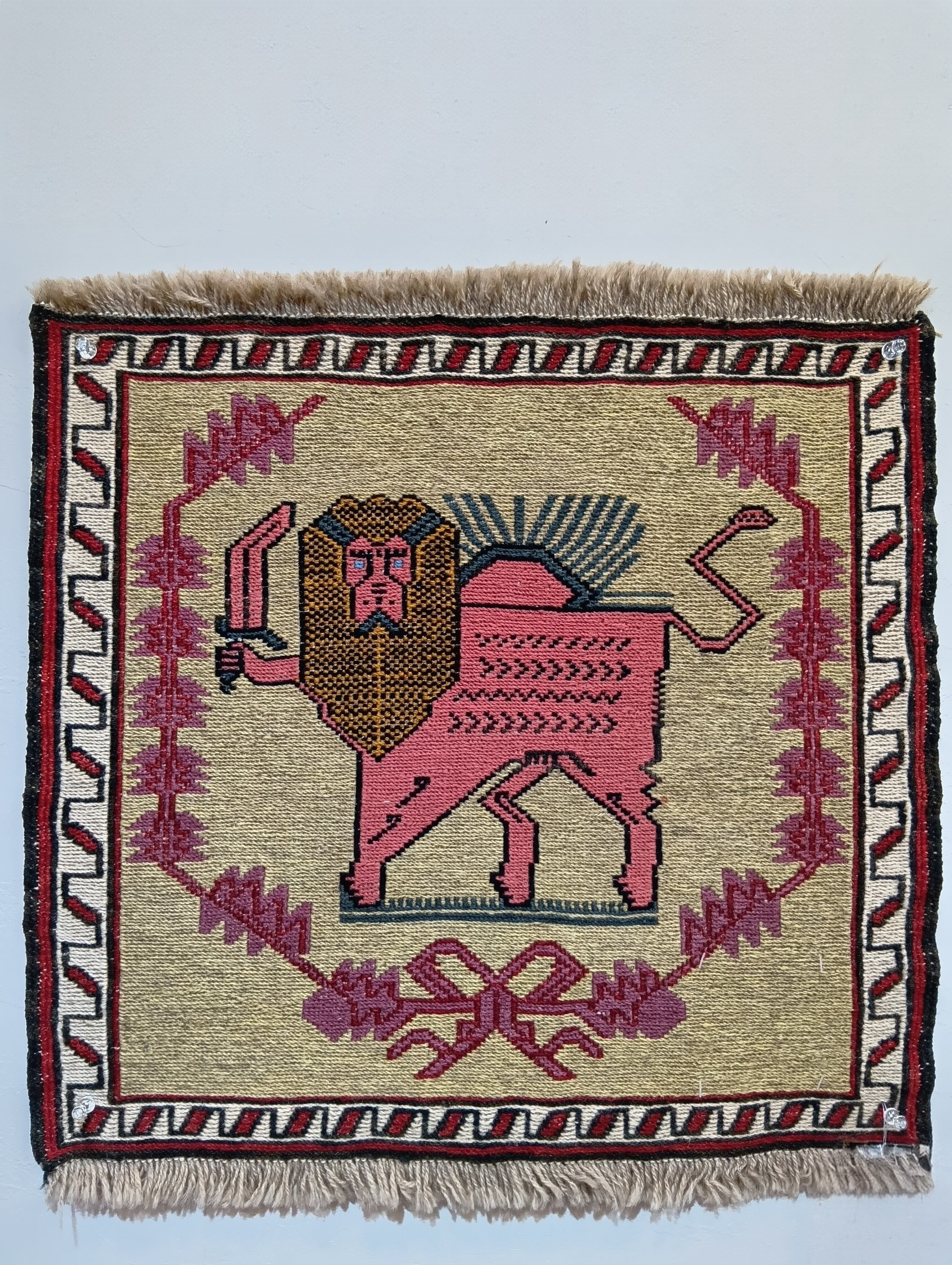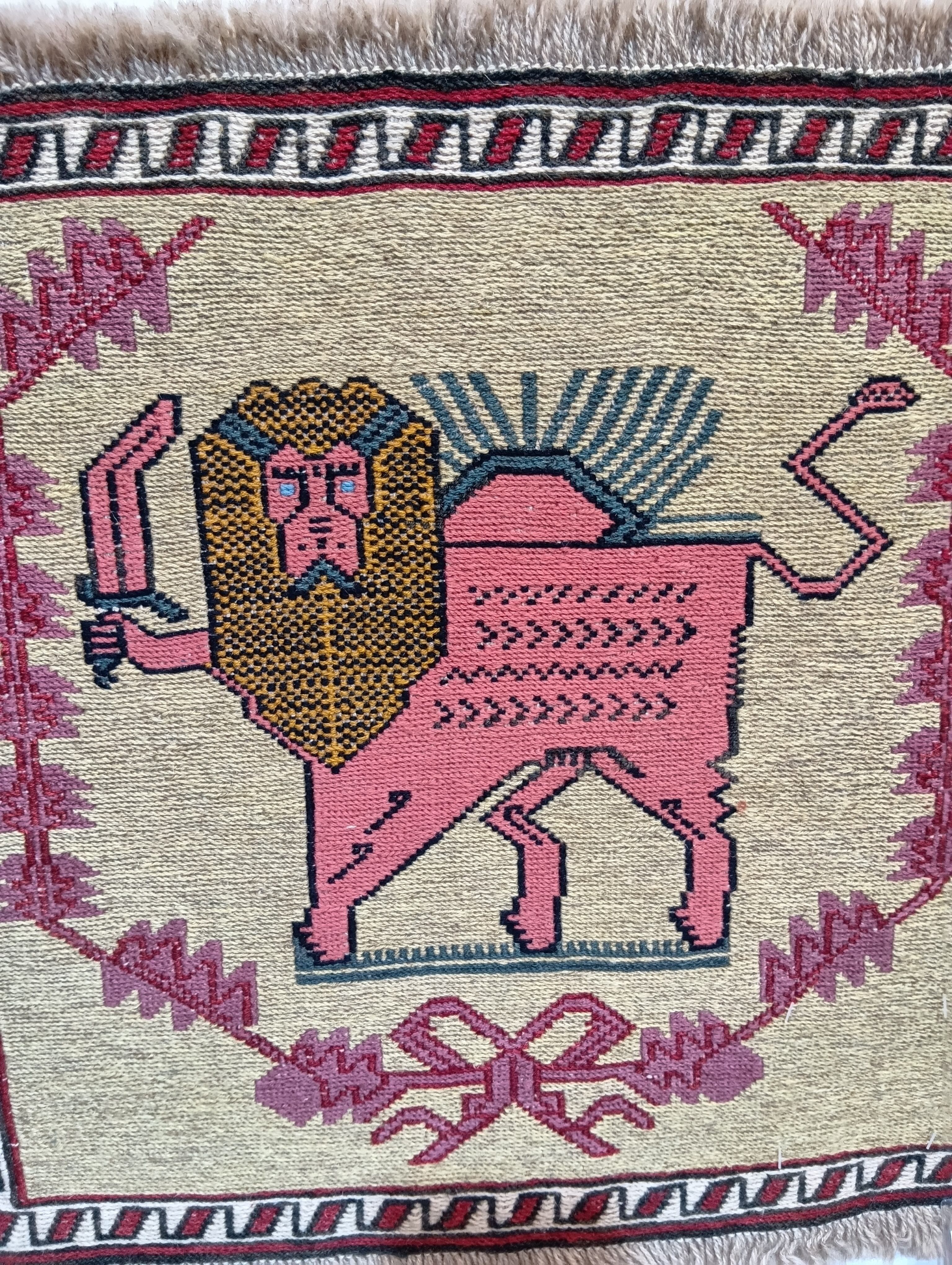 歴代のイランの国旗にも配されていた「サーベルライオン」をかわいいピンクで織り上げたキリム(平織り)です。サーベル(刀)を持ち、背後から太陽が神々しく照らし、悠々と立つライオンは、リーダーシップや権力、統率力、愛と勇気の象徴です。