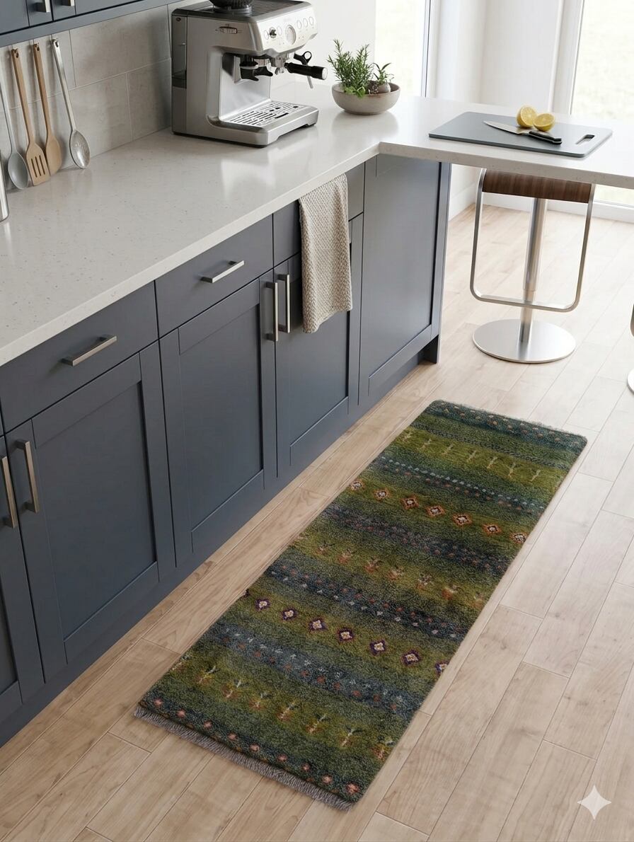 職人の手仕事によって丁寧に織り上げられたこの一枚は、温かみのあるウールの質感と、細やかに施されたモチーフが魅力。落ち着いたグリーンの色合いはどんなインテリアとも相性が良く、特に木製の家具(オークやウォールナットなど)との組み合わせは抜群です。