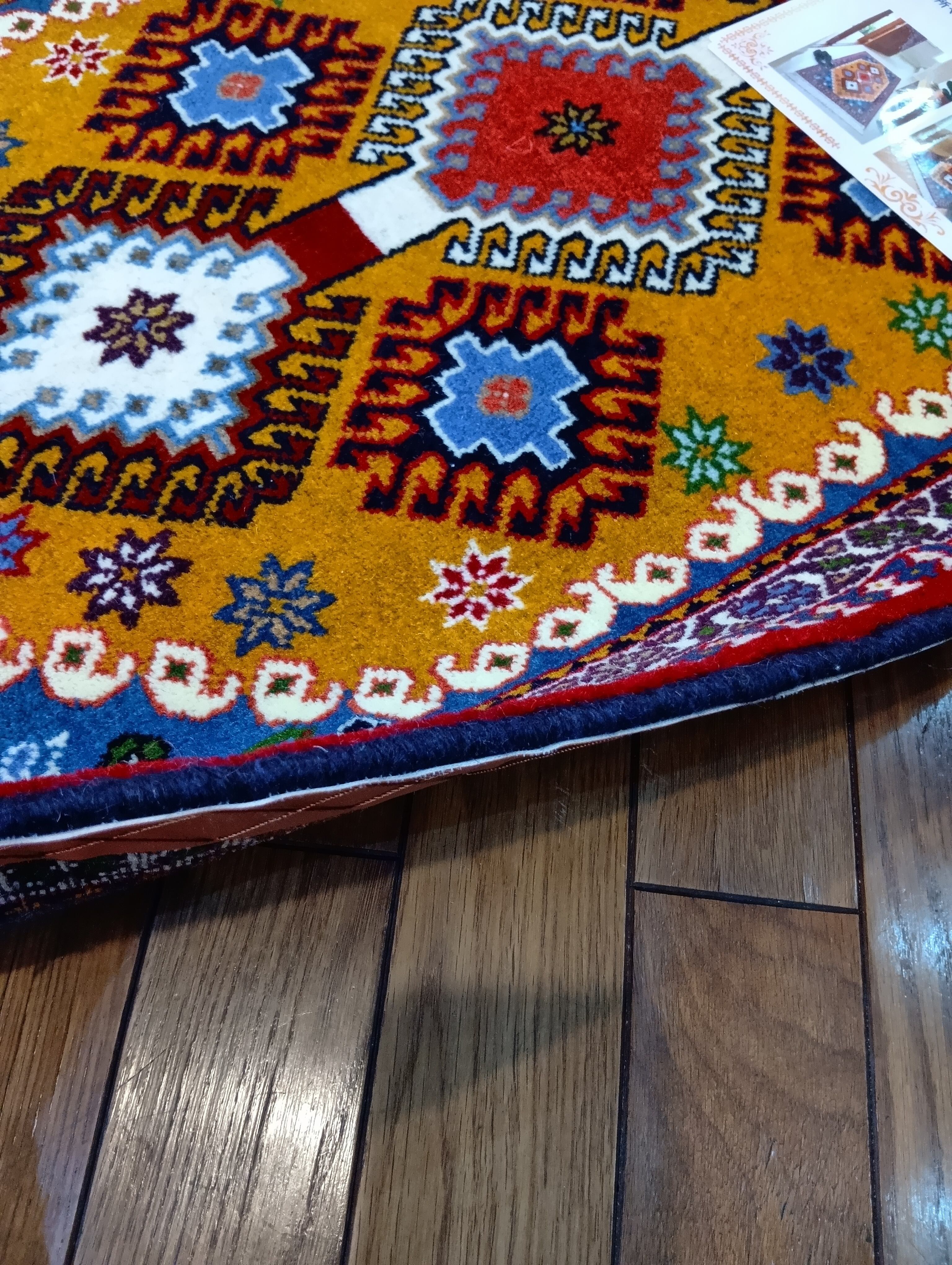 パッと目を引く鮮やかなイエローを基調に、ブルーやレッドの幾何学模様が並ぶ、元気の出るデザインです。どんな床色にも馴染みやすく、置くだけでお部屋の印象をガラリと変えてくれます。