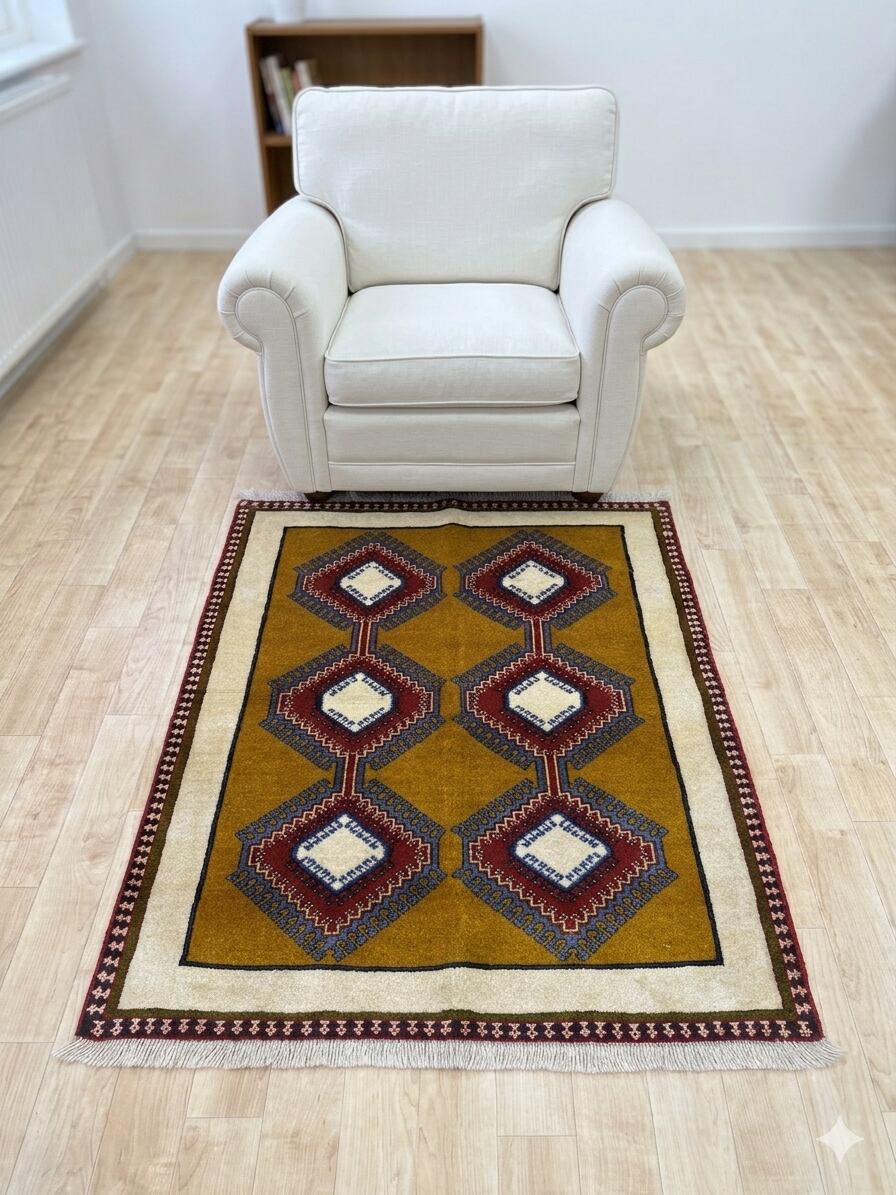 パッと目を引くマスタードイエローをベースに、深いボルドーとネイビーの幾何学模様が美しく並んだ、手織りのウールラグです。