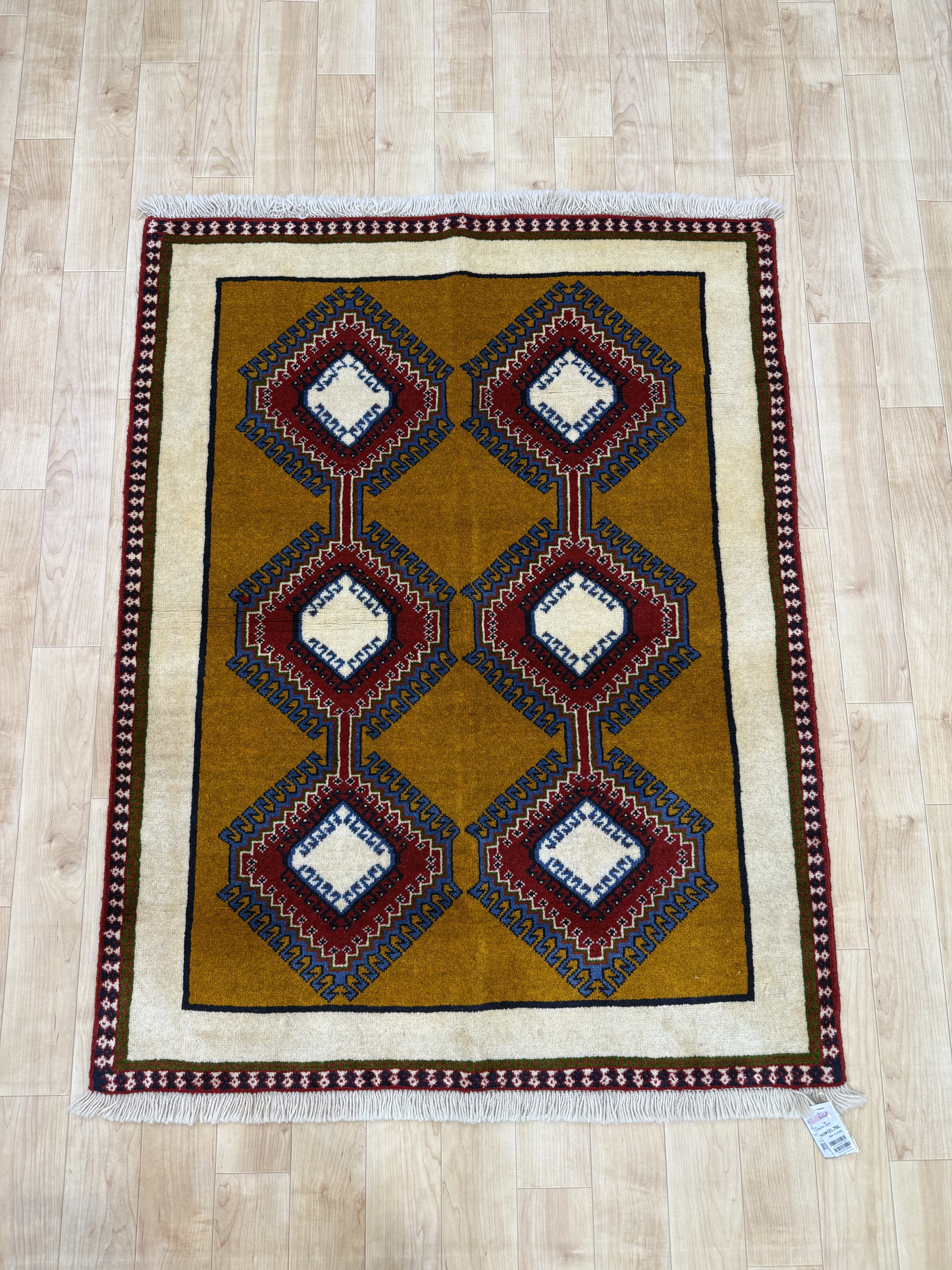 「マスタード&ボルドーの幾何学模様」トライバルラグ(約105x135cm)送料無料