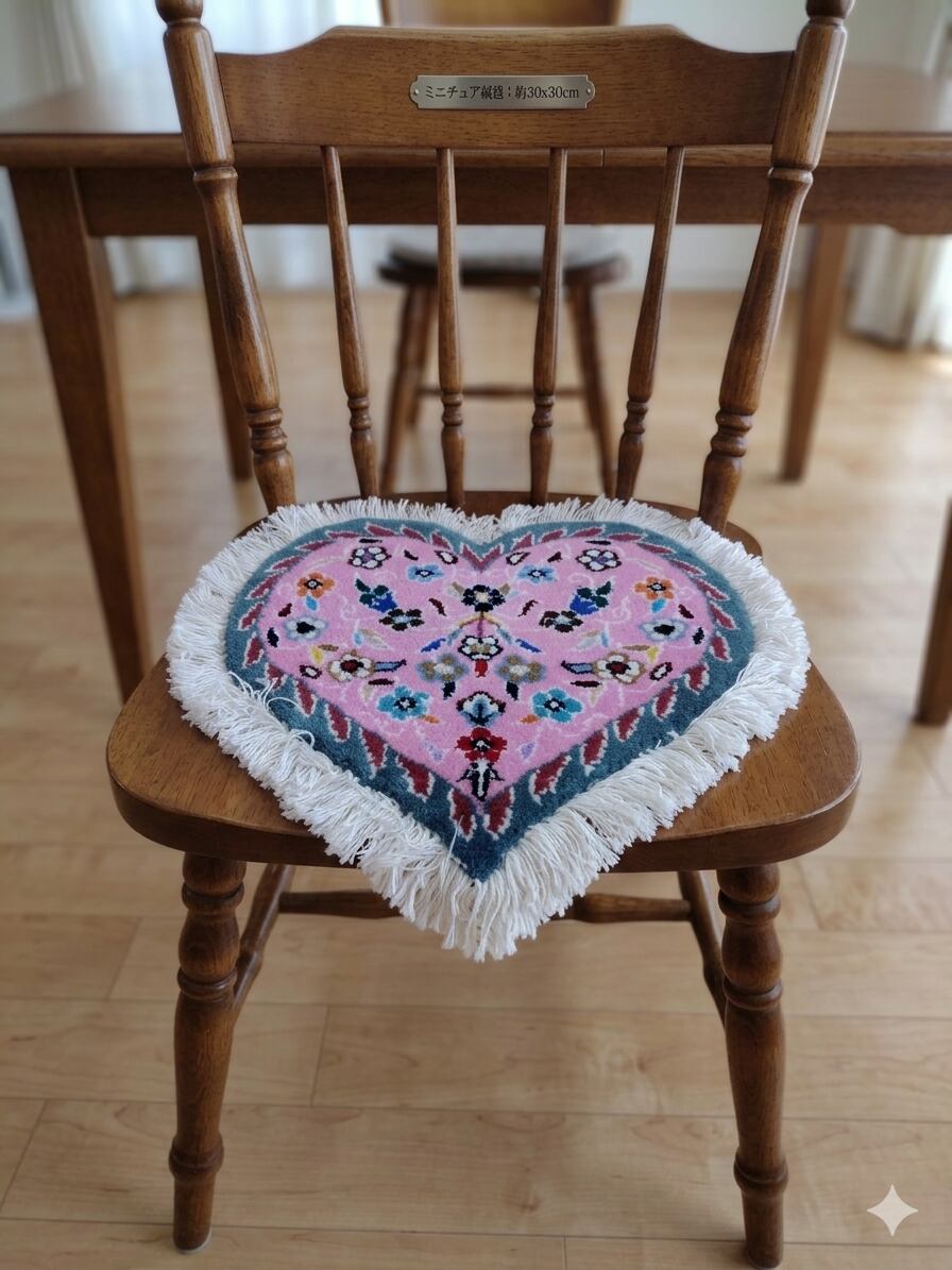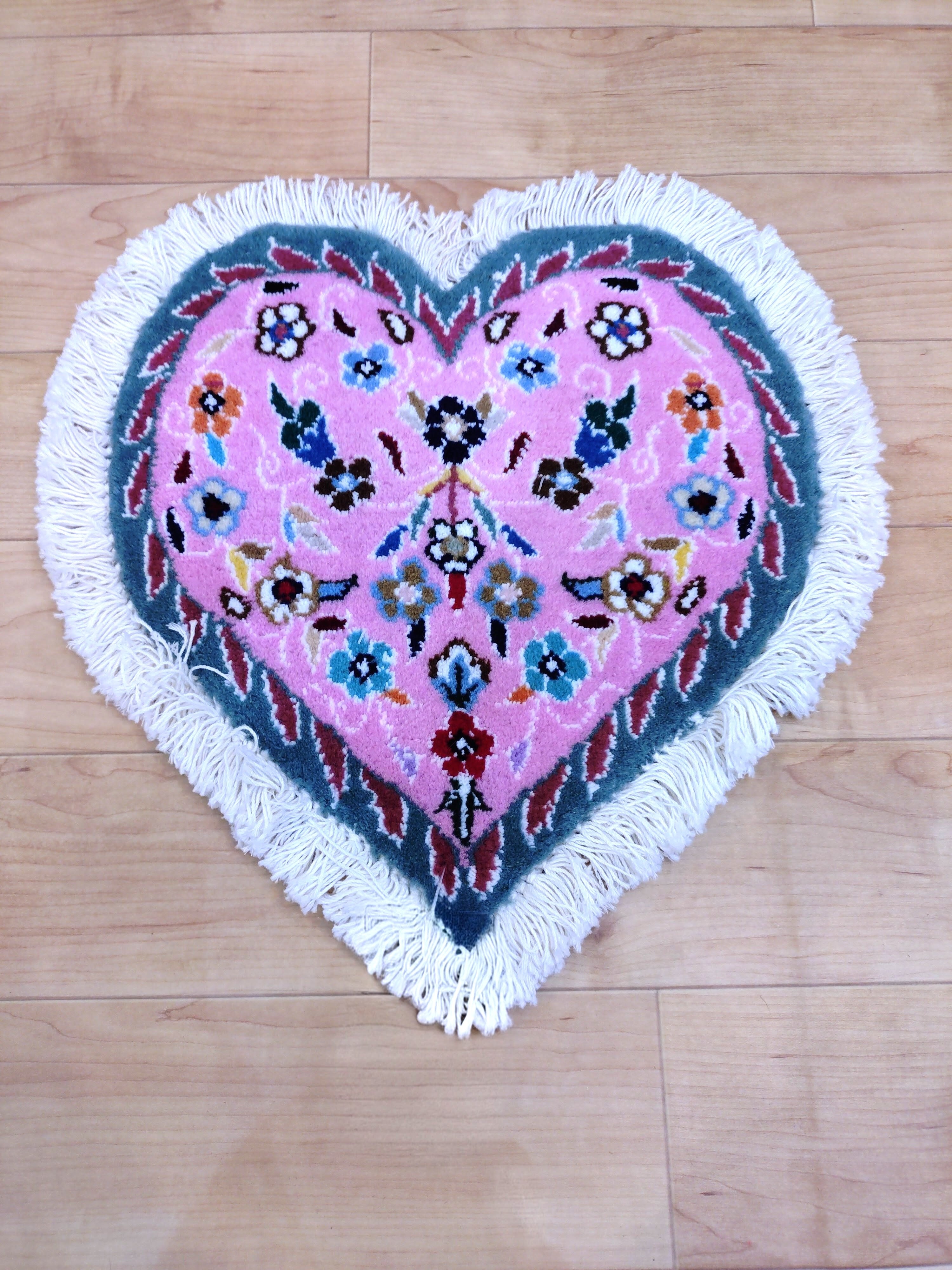 お部屋のアクセントにぴったりな、愛らしいハート型のミニ絨毯です。