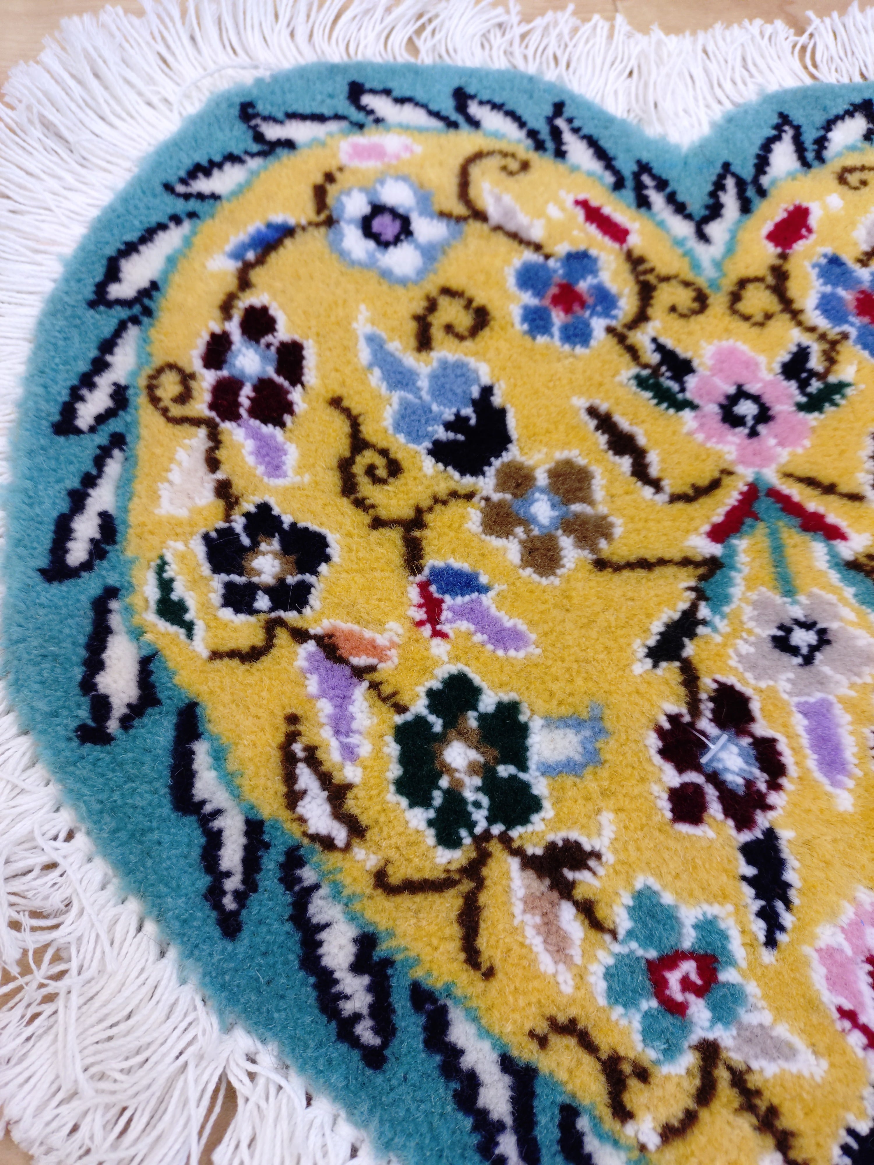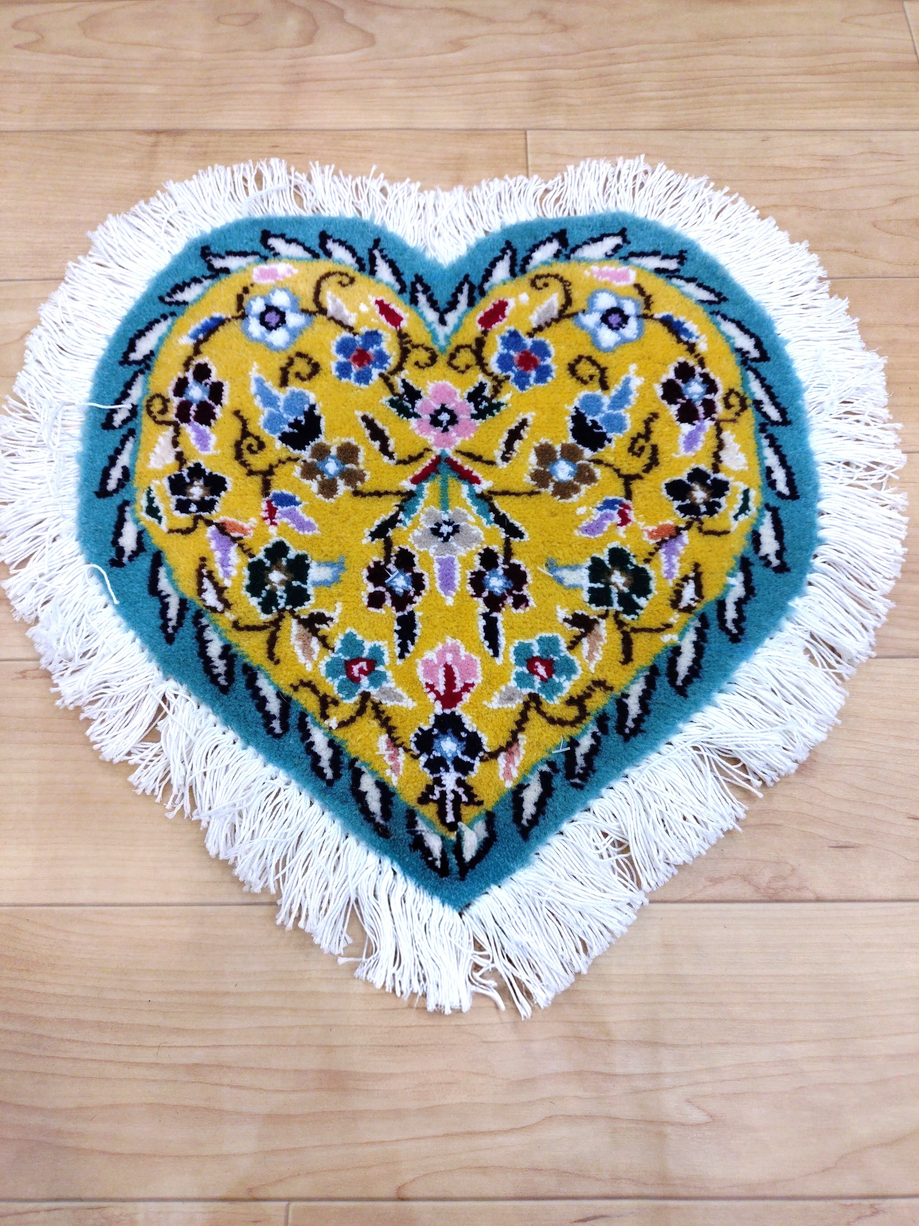 「ハートアート」(ターコイズ×イエロ-)手織りペルシャ絨毯【約30×30cm】 (送料無料)
