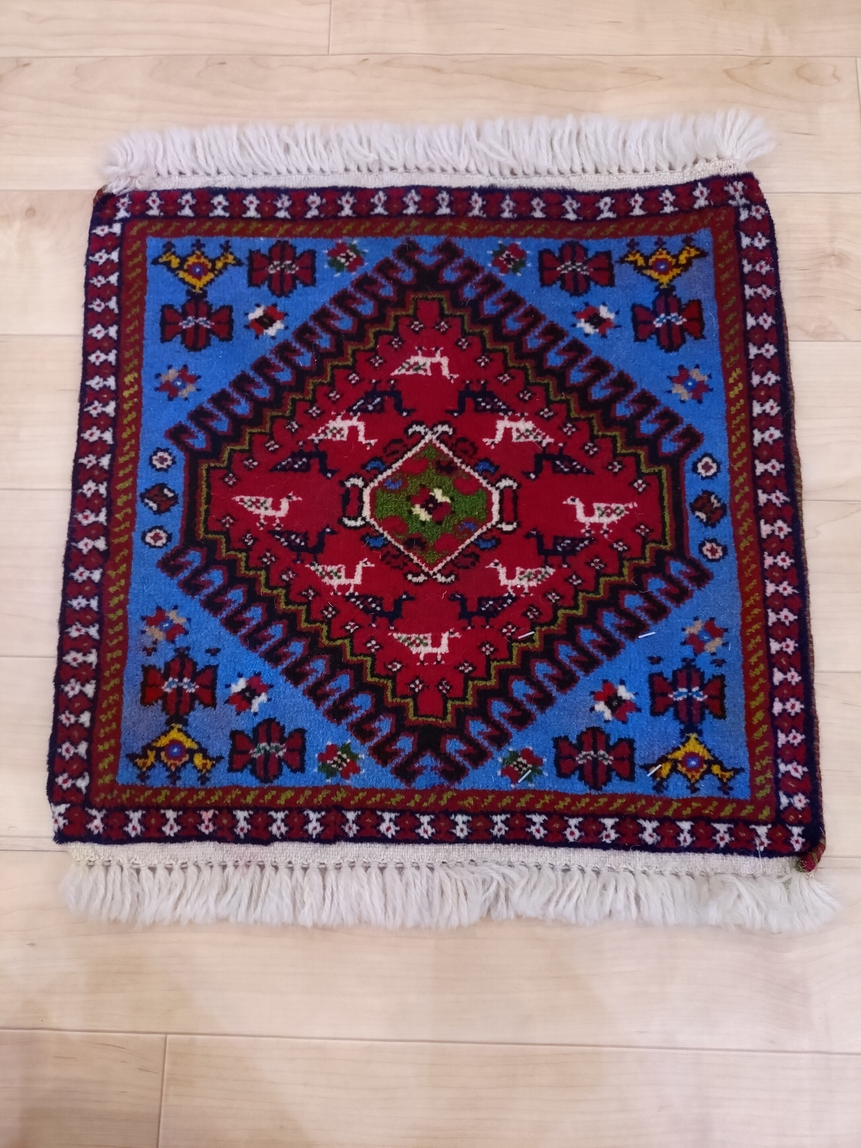 [幸せを運ぶ鳥]鮮やかなブルー&レッドトライバルミニラグ 約40×40cm【送料無料】