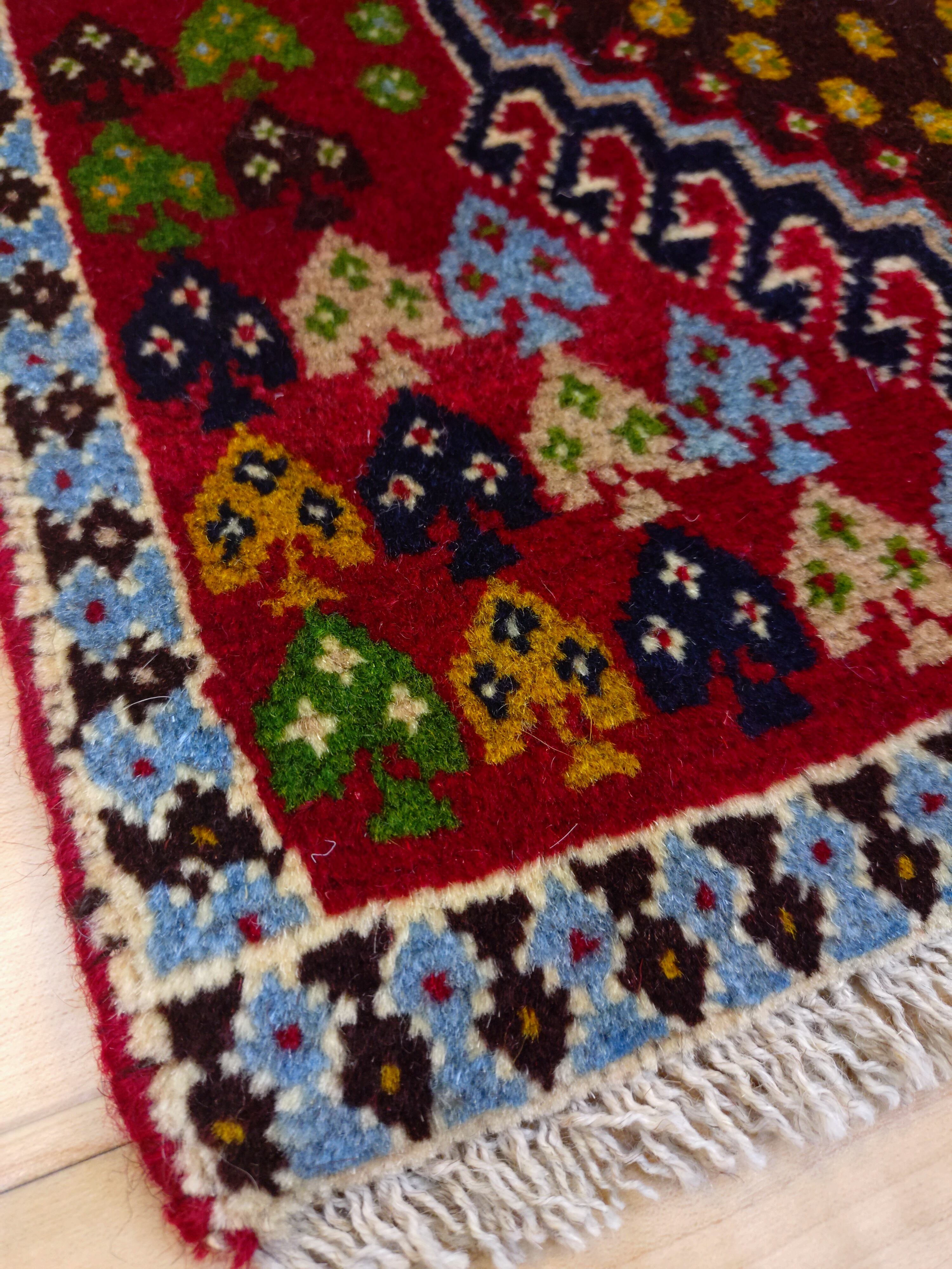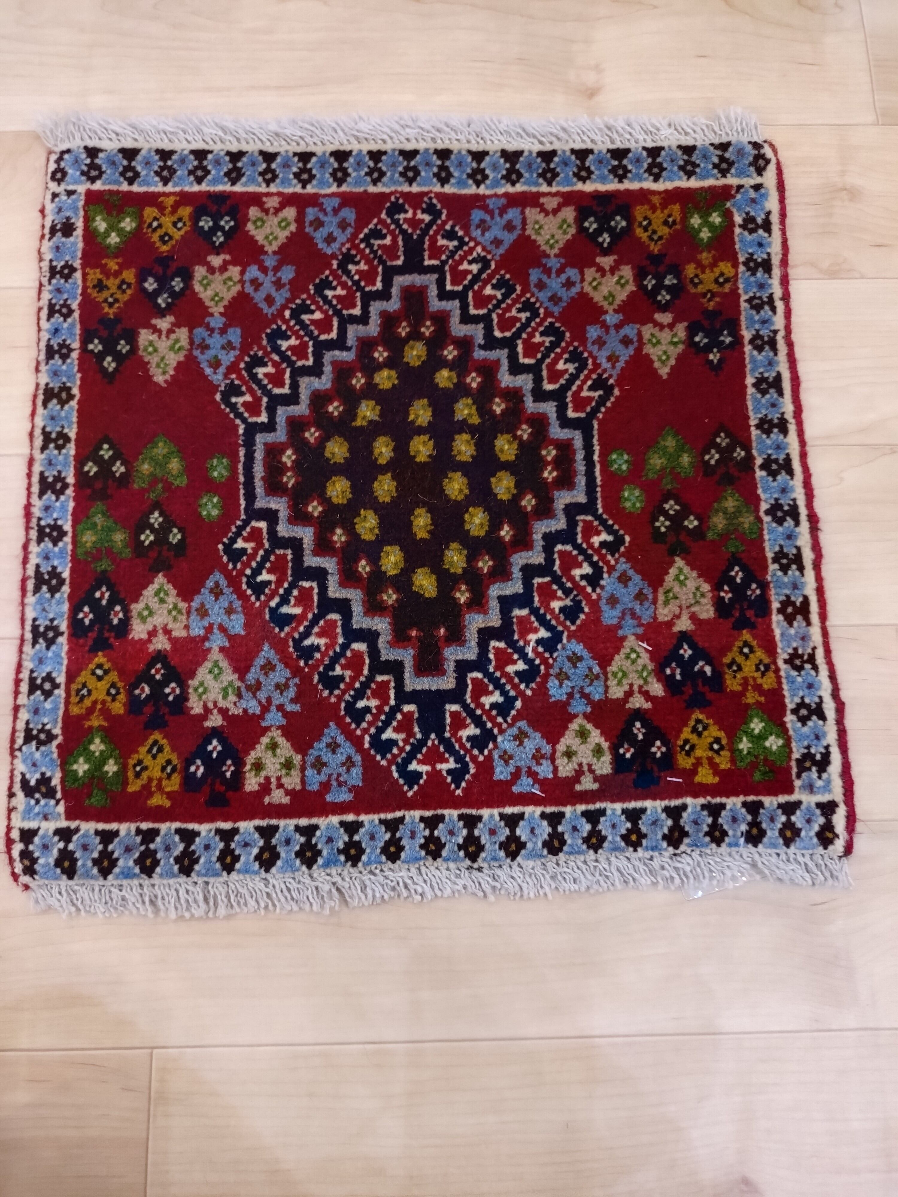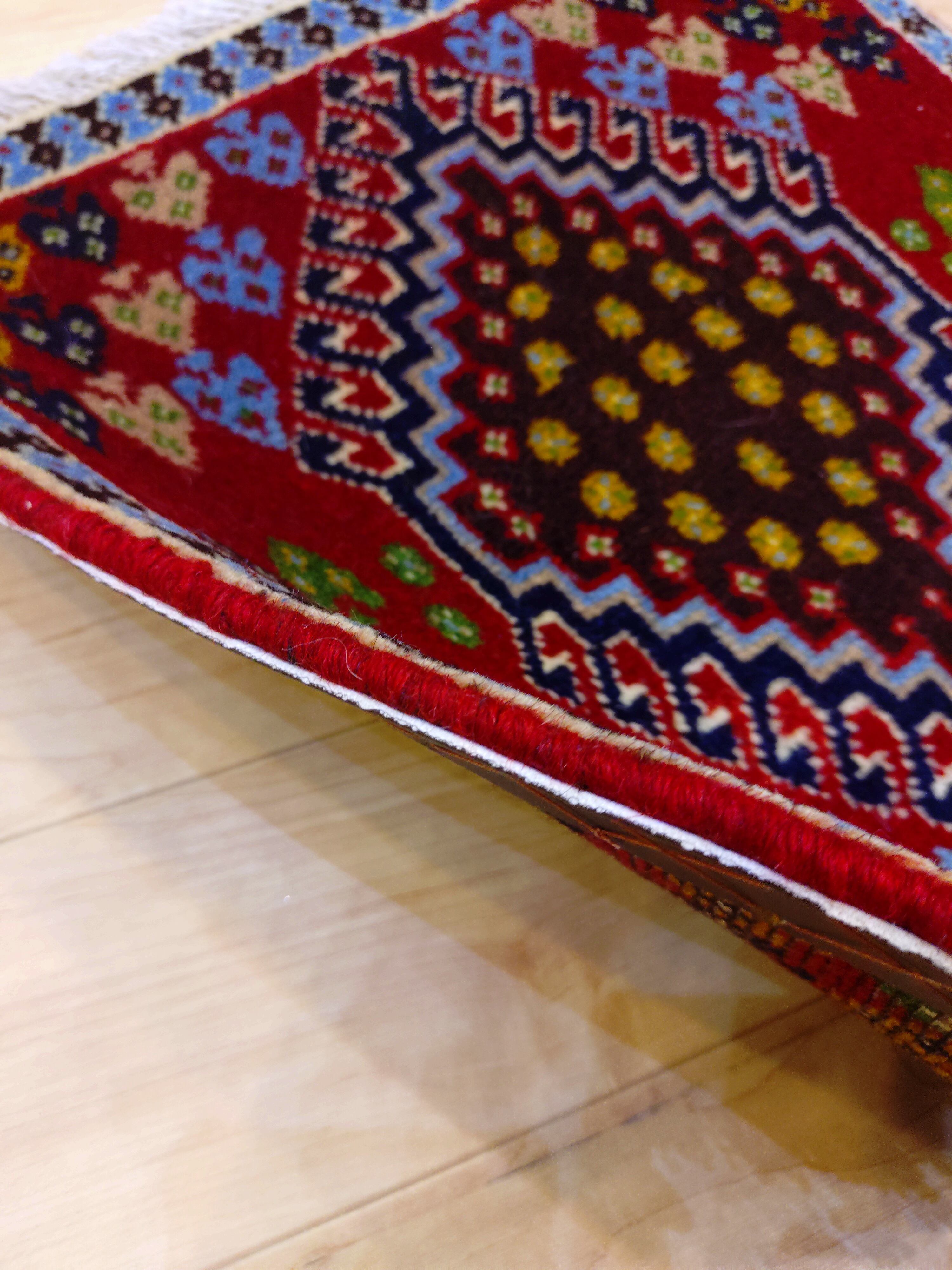 鮮やかなレッドをベースに、中央には力強いメダリオン、その周りには「長寿」や「健康」への願いが込められた「生命の樹」のモチーフが色とりどりに配されています。手織りならではの少し不揃いな形や、色のグラデーション(アブラッシュ)が、機械織りにはない温かみを感じさせてくれます。